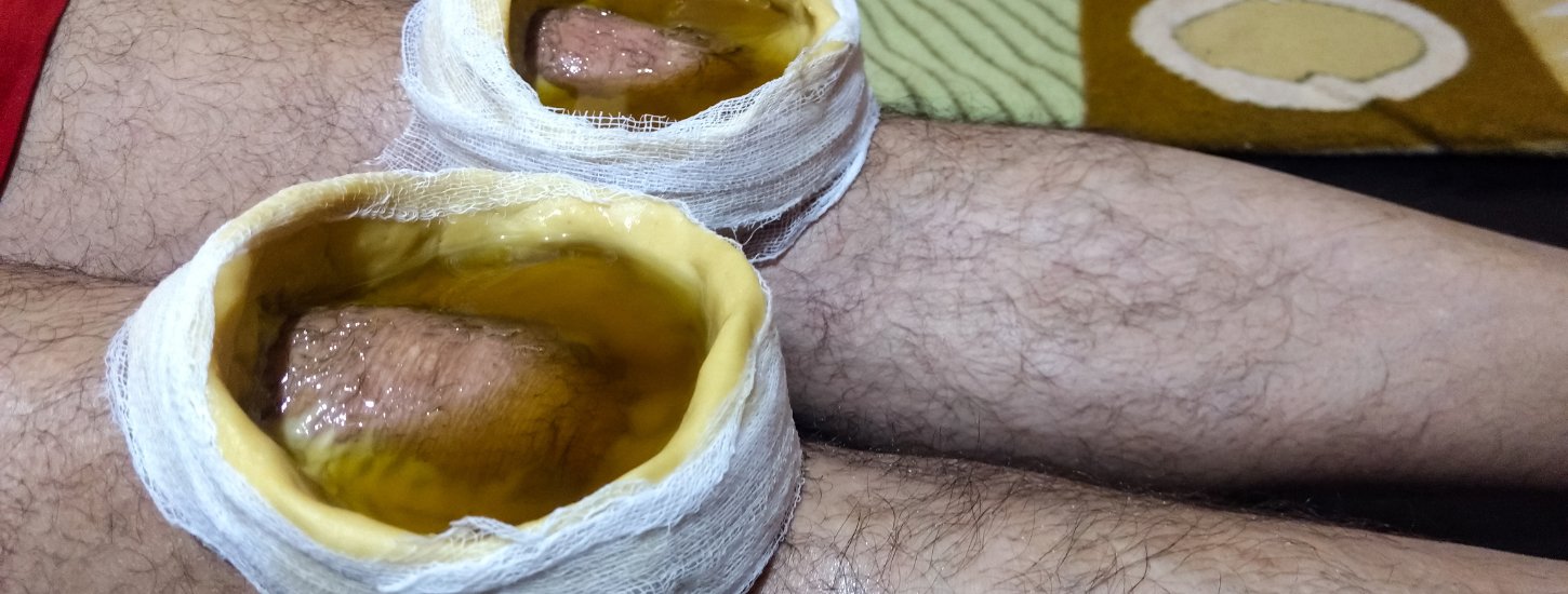 The Janu means Knee joint and Basti – means to hold (compartment which holds) Thus Janu Vasti means a treatment in which medicated oils are poured and pooled for a fixed duration of time in a compartment or a cabin constructed around the knee joint / joints using wet flour of black gram.